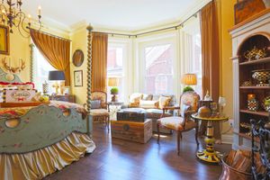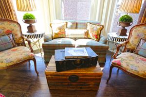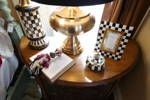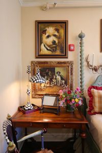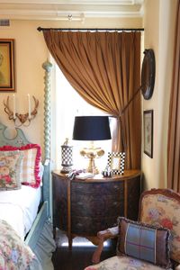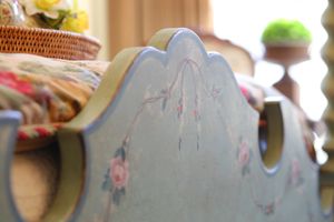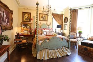 Four Honey Bees Cottage was chosen to design the Master Bedroom, with the design centered around a hand-painted Italian four-poster bed that set the tone for the space. Blending French design with American classic elements, the room layers florals, plaids, and leather accents to create a timeless and inviting retreat.